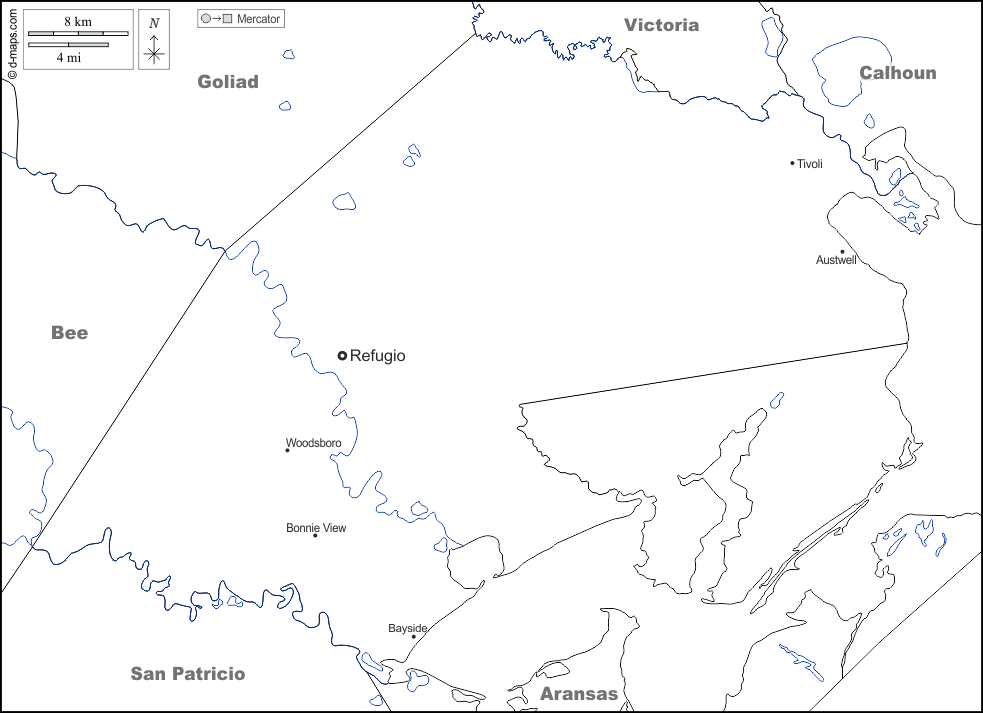 d-maps > United States of America (USA) > Texas > Refugio County > boundaries, hydrography, main cities, names, white