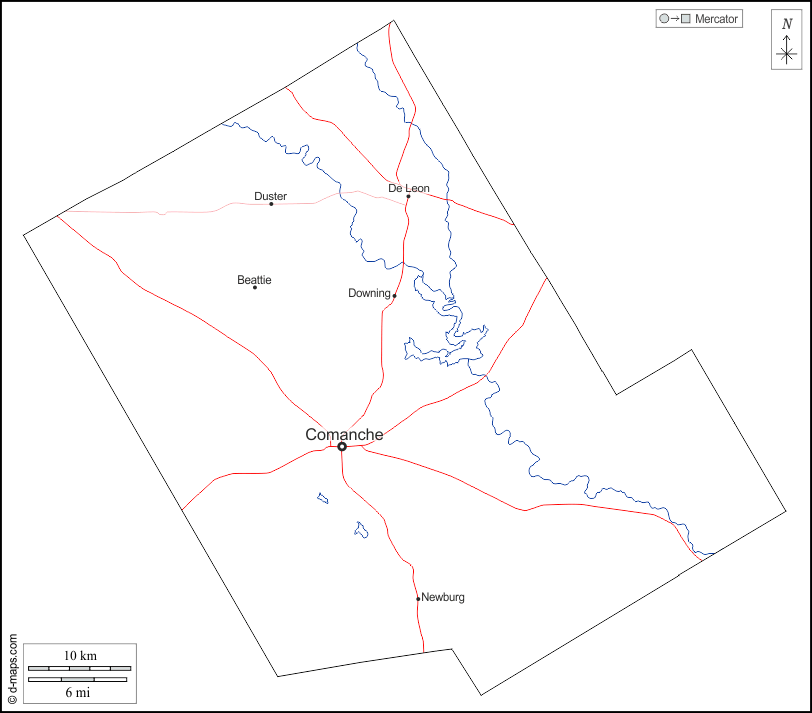 d-maps > United States of America (USA) > Texas > Comanche County > outline, hydrography, main cities, roads, names, white