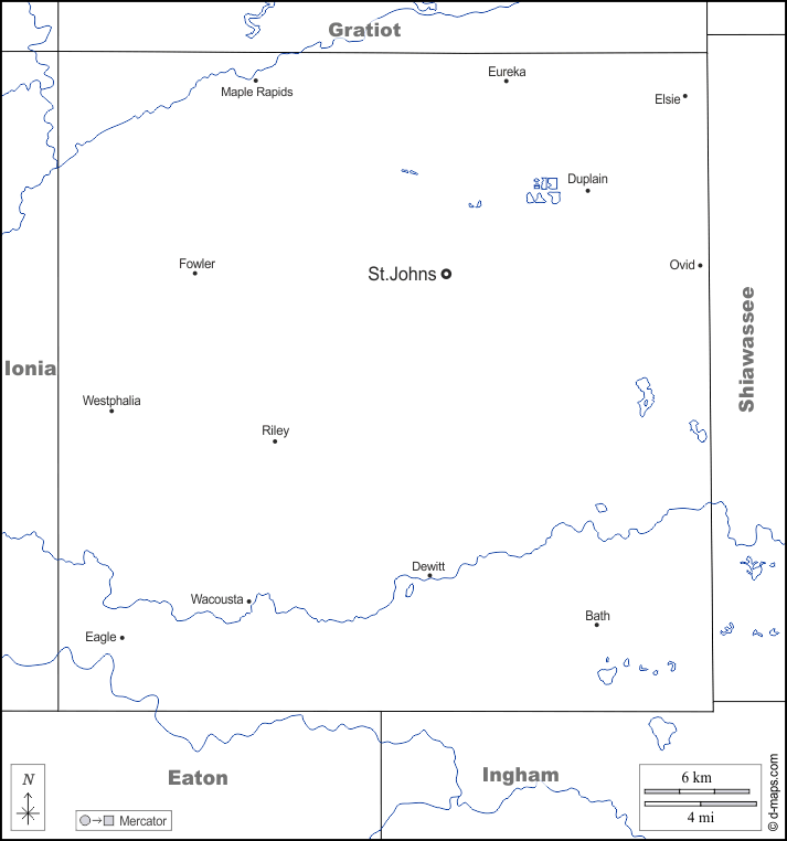 d-maps > United States of America (USA) > Michigan > Clinton County > boundaries, hydrography, main cities, names, white