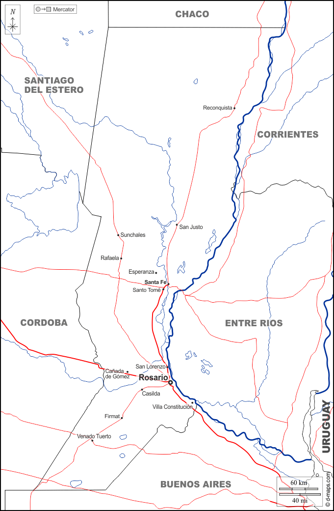 d-maps > Americas > Argentina > Santa Fe Province > boundaries, hydrography, main cities, roads, names, white