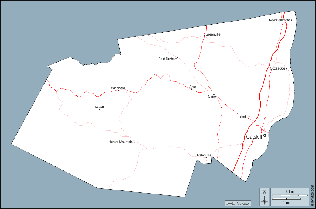 d-maps > United States of America (USA) > New York > Greene County > outline, main cities, roads, names
