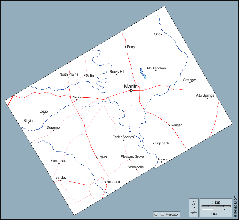 d-maps > United States of America (USA) > Texas > Falls County > outline, hydrography, main cities, roads, names