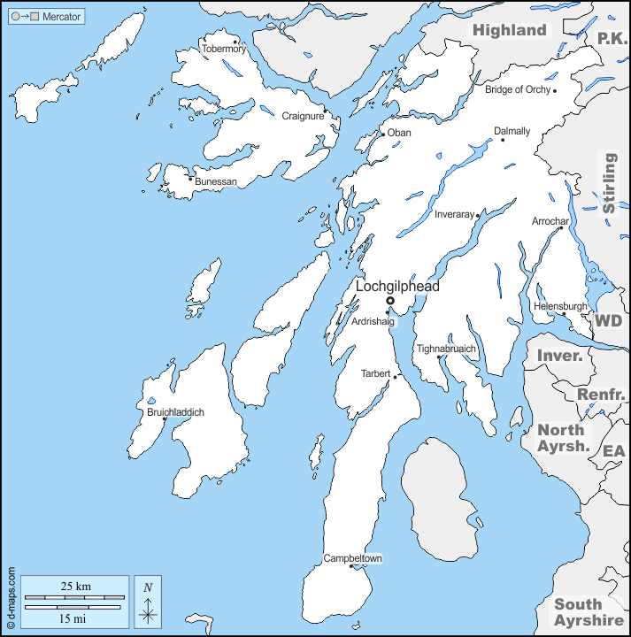 d-maps > Europe > United Kingdom > Argyll and Bute > boundaries, hydrography, main cities, names
