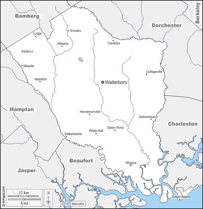 d-maps > United States of America (USA) > South Carolina > Colleton County > boundaries, hydrography, main cities, names