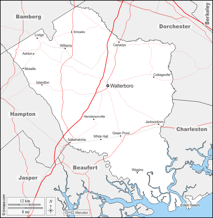 d-maps > United States of America (USA) > South Carolina > Colleton County > boundaries, main cities, roads, names