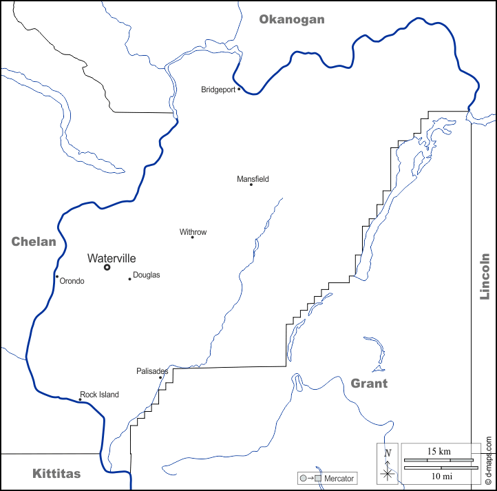 d-maps > United States of America (USA) > Washington > Douglas County > boundaries, hydrography, main cities, names, white