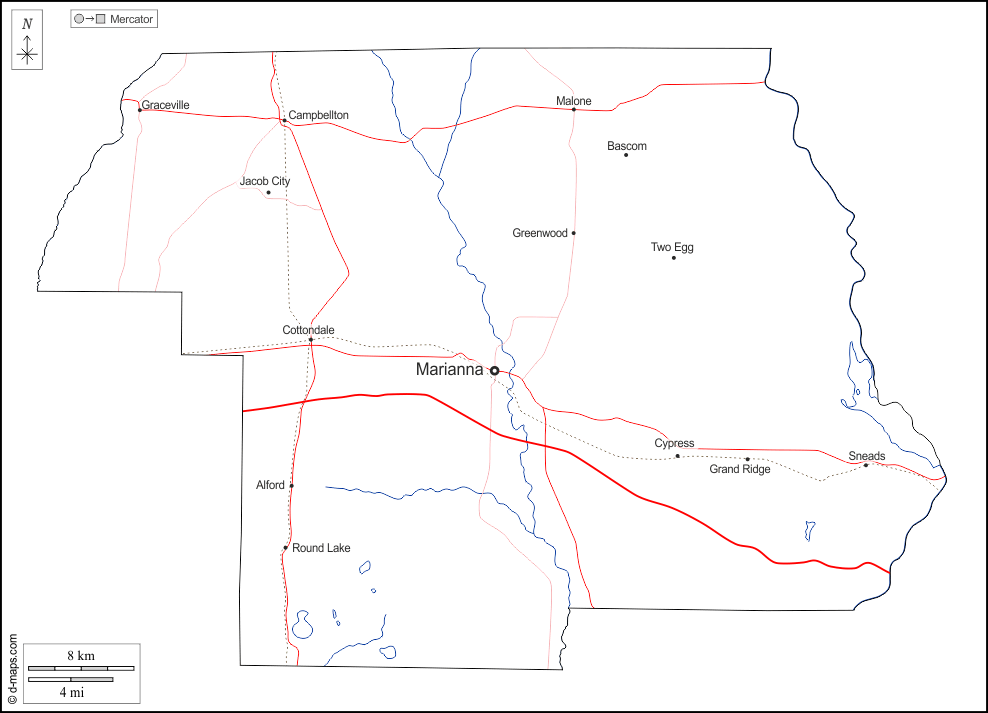 d-maps > United States of America (USA) > Florida > Jackson County > outline, hydrography, main cities, roads, names, white