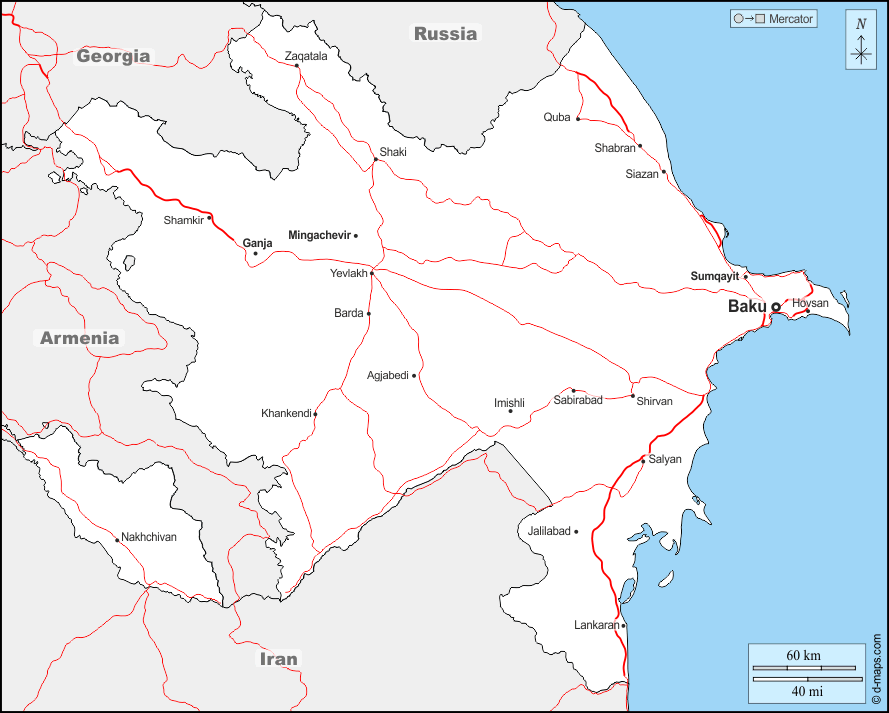 d-maps > Asia > Azerbaijan > boundaries, main cities, roads, names