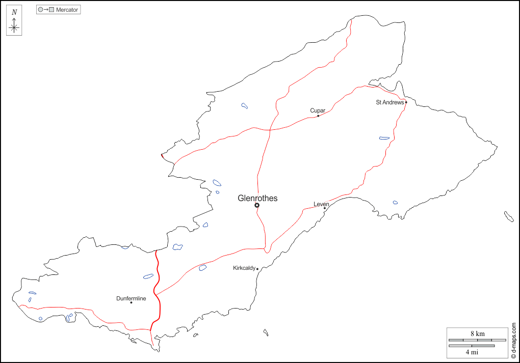 d-maps > Europe > United Kingdom > Fife > outline, hydrography, main cities, roads, names, white