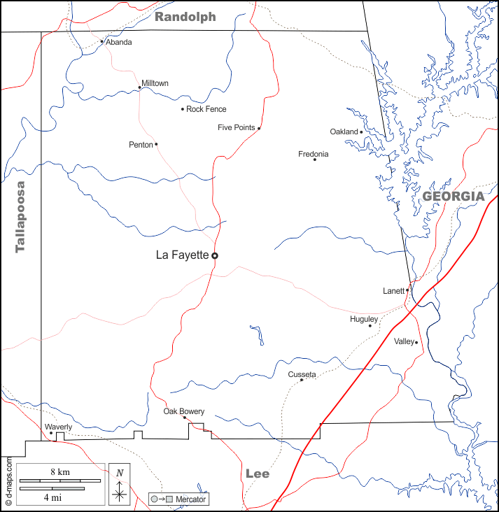 d-maps > United States of America (USA) > Alabama > Chambers County > boundaries, hydrography, main cities, roads, names, white