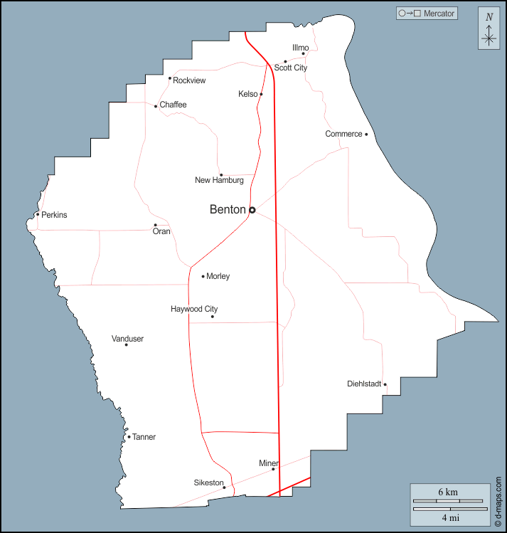 d-maps > United States of America (USA) > Missouri > Scott County > outline, main cities, roads, names