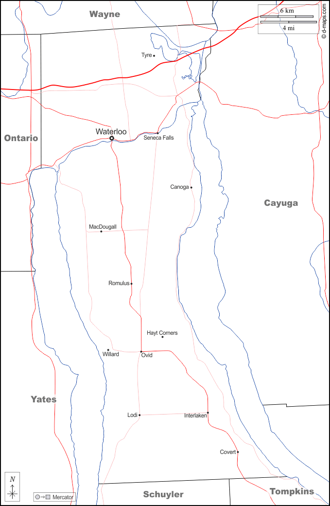 d-maps > United States of America (USA) > New York > Seneca County > boundaries, hydrography, main cities, roads, names, white