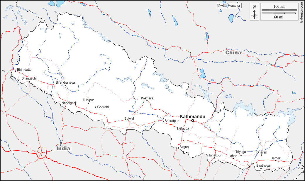 d-maps > Asia > Nepal > boundaries, hydrography, main cities, roads, names