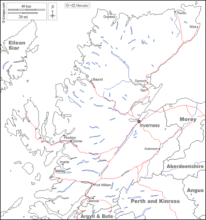 d-maps > Europe > United Kingdom > Highland > boundaries, hydrography, main cities, roads, names, white