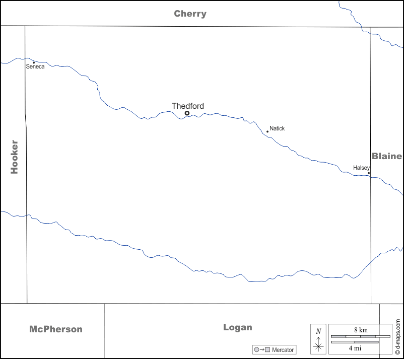 d-maps > United States of America (USA) > Nebraska > Thomas County > boundaries, hydrography, main cities, names, white
