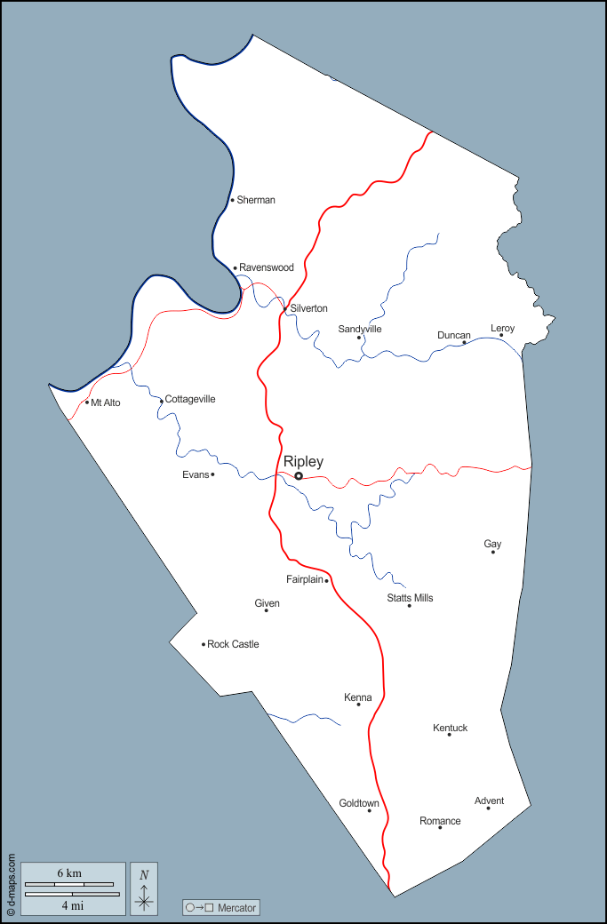 d-maps > United States of America (USA) > West Virginia > Jackson County > outline, hydrography, main cities, roads, names