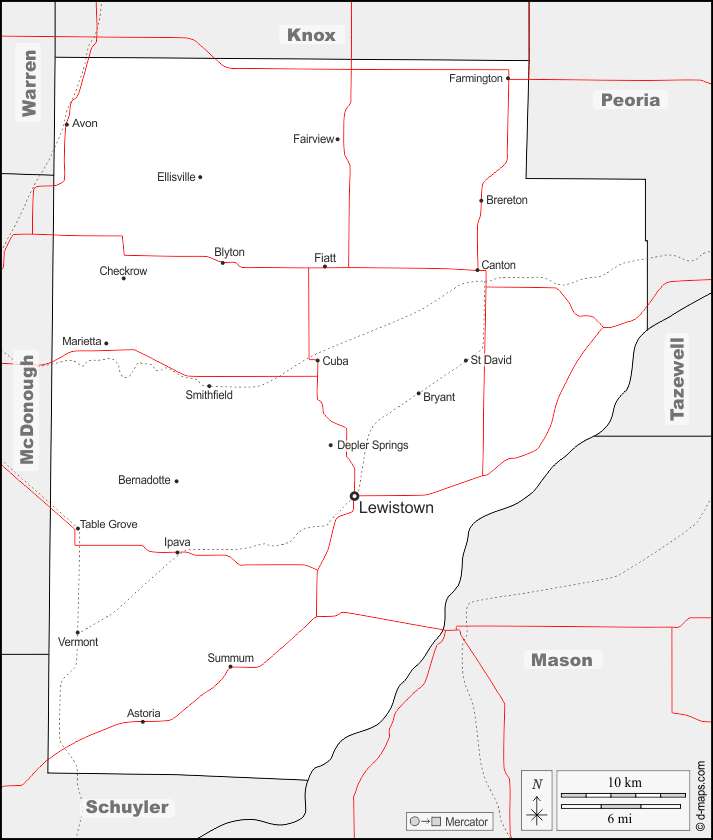 d-maps > United States of America (USA) > Illinois > Fulton County > boundaries, main cities, roads, names