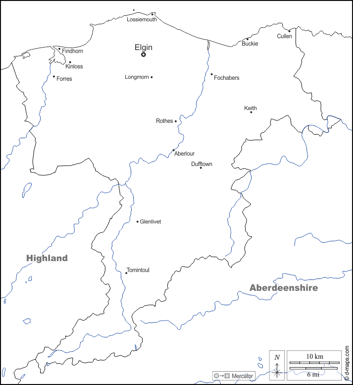 d-maps > Europe > United Kingdom > Moray > boundaries, hydrography, main cities, names, white