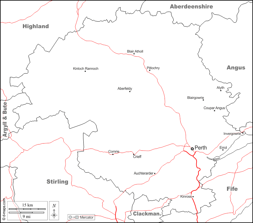 d-maps > Europe > United Kingdom > Perth and Kinross > boundaries, main cities, roads, names, white