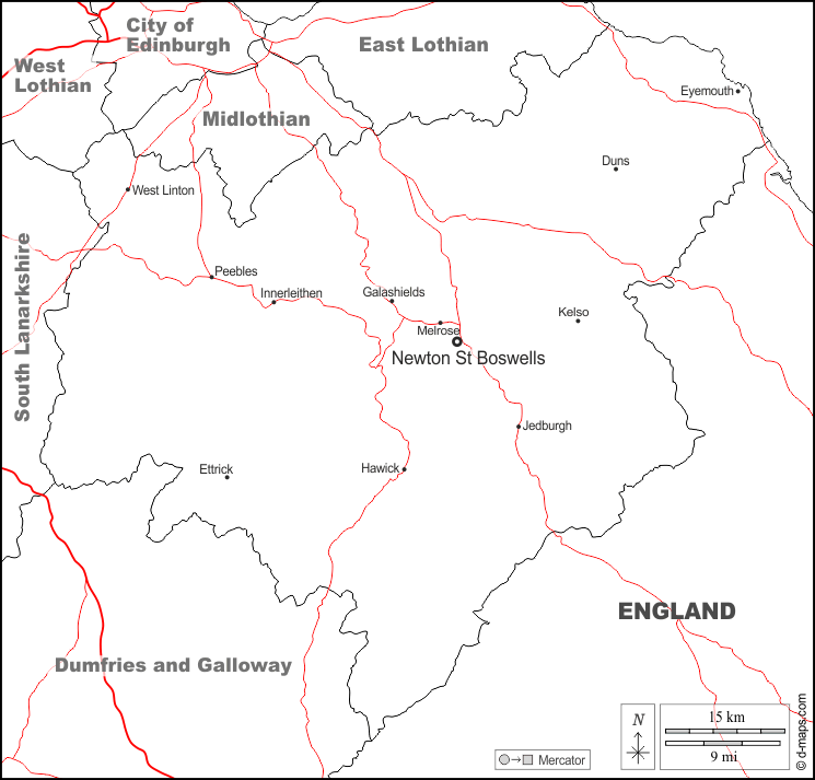 d-maps > Europe > United Kingdom > Scottish Borders > boundaries, main cities, roads, names, white