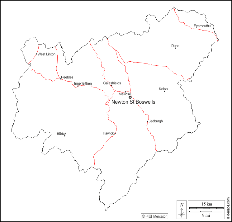 d-maps > Europe > United Kingdom > Scottish Borders > outline, main cities, roads, names, white