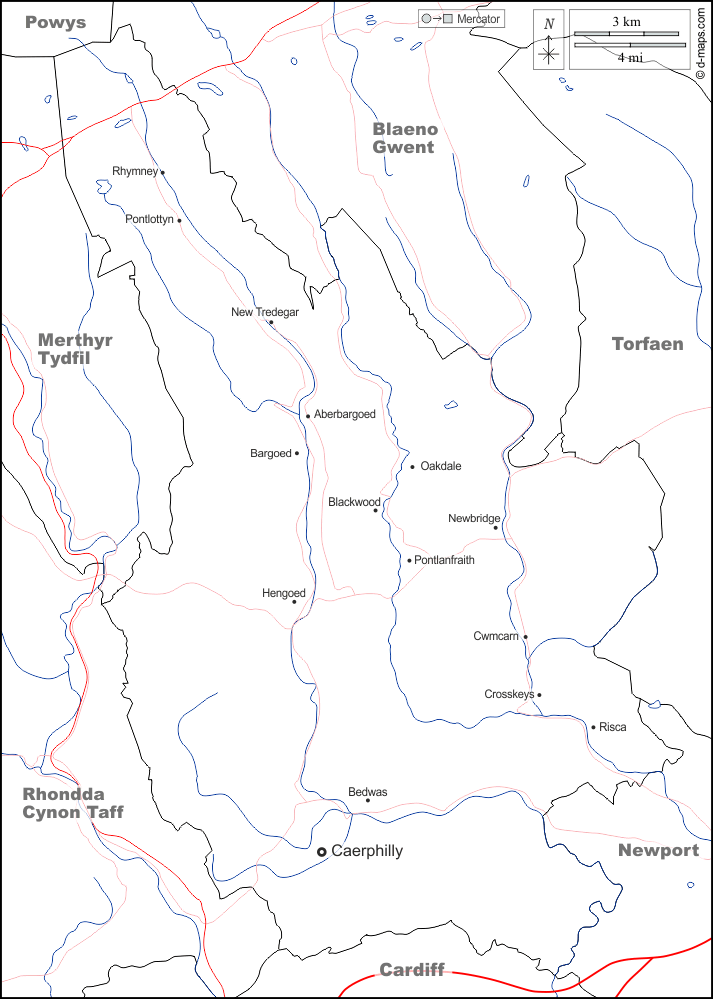 d-maps > Europe > United Kingdom > Caerphilly > boundaries, hydrography, main cities, roads, names, white