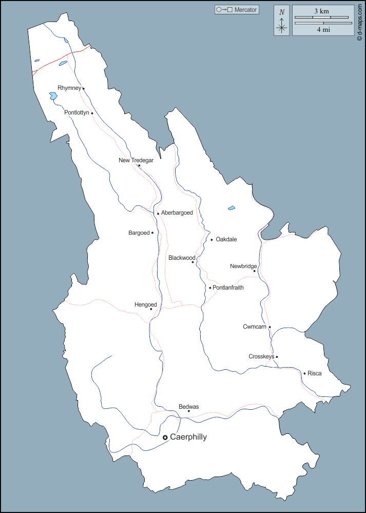 d-maps > Europe > United Kingdom > Caerphilly > outline, hydrography, main cities, roads, names