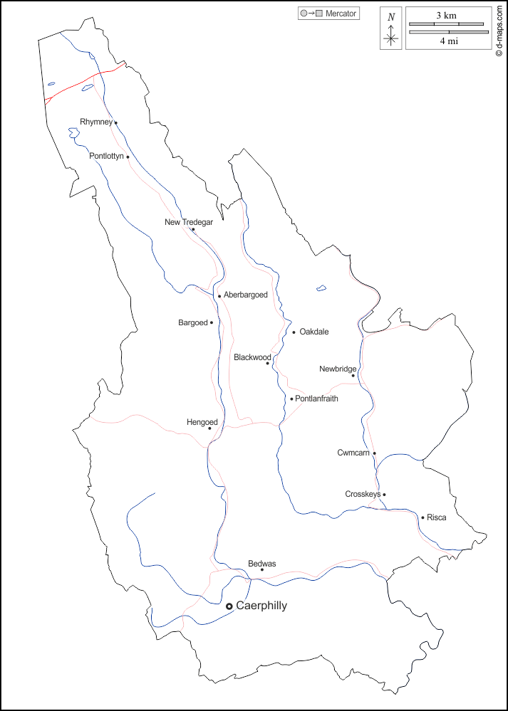 d-maps > Europe > United Kingdom > Caerphilly > outline, hydrography, main cities, roads, names, white