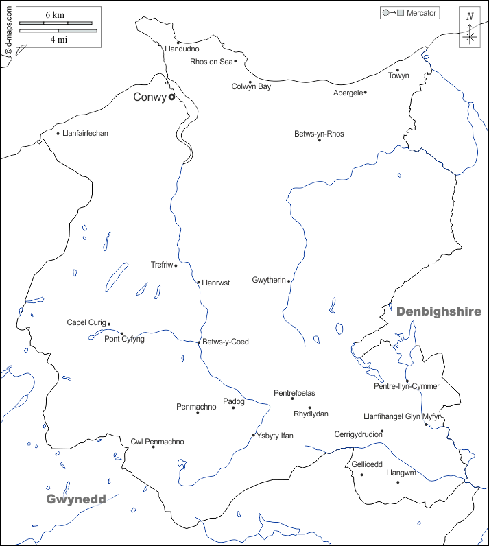 d-maps > Europe > United Kingdom > Conwy > boundaries, hydrography, main cities, names, white