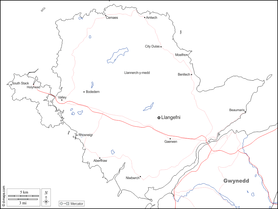 Europe > United Kingdom > Anglesey > boundaries, hydrography, main cities, roads, names, white