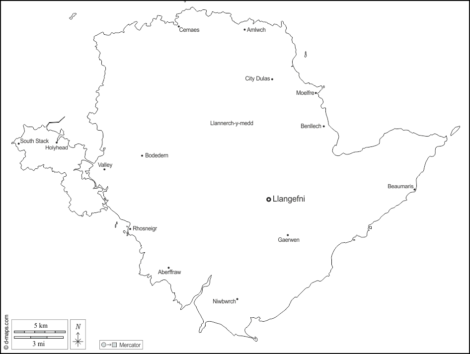d-maps > Europe > United Kingdom > Anglesey > outline, main cities, names, white