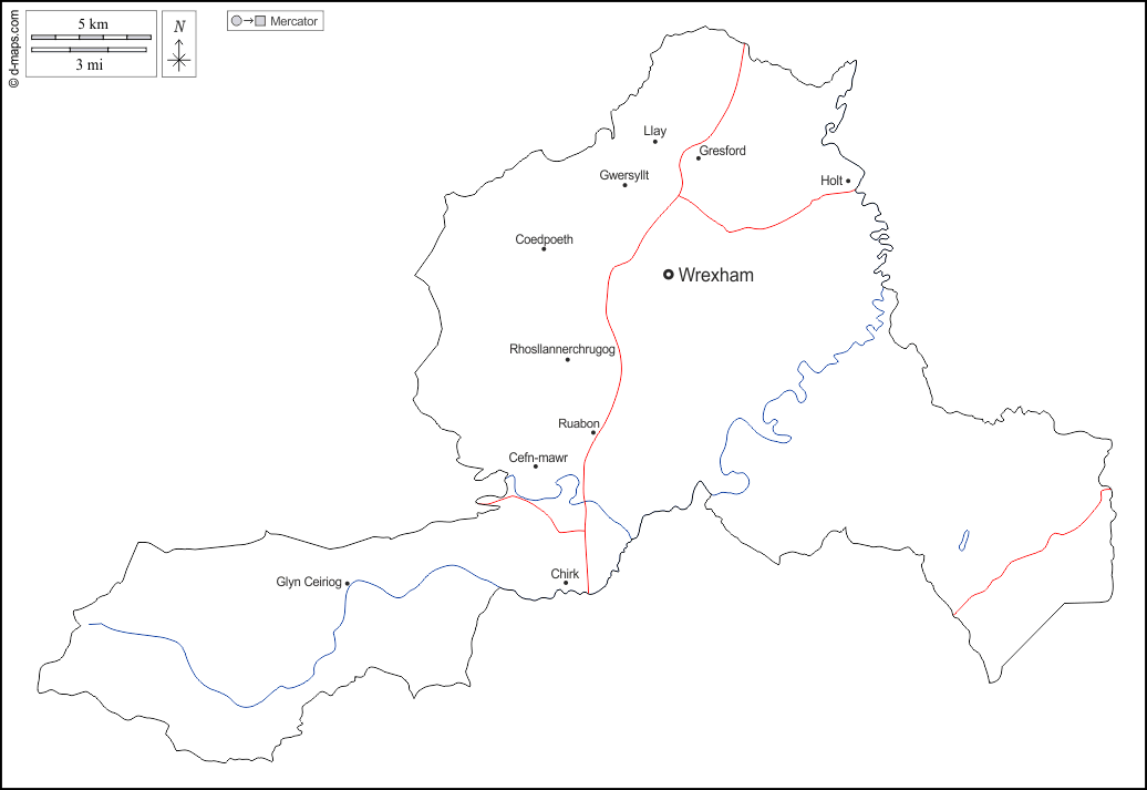 d-maps > Europe > United Kingdom > Wrexham > outline, hydrography, main cities, roads, names, white