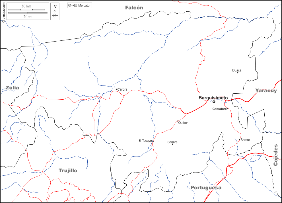 d-maps > Americas > Venezuela > Lara > boundaries, hydrography, main cities, roads, names, white