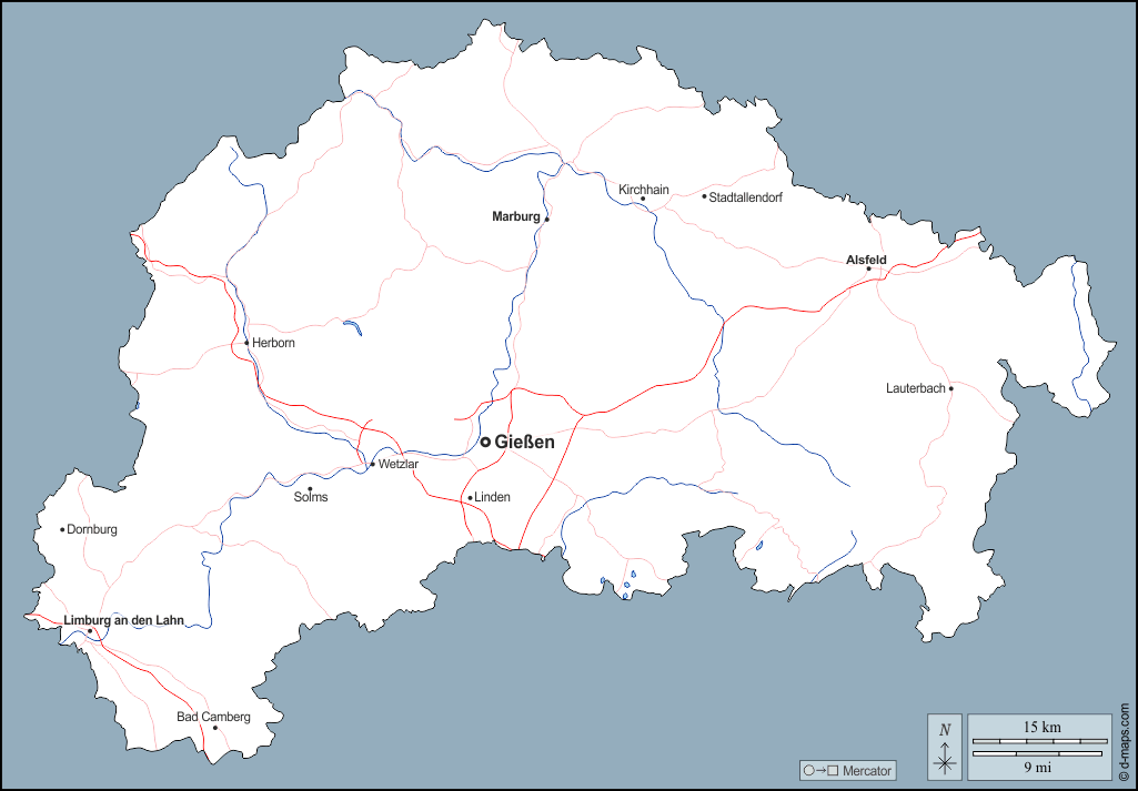 d-maps > Europe > Germany > Giessen administrative district > outline, hydrography, main cities, roads, names