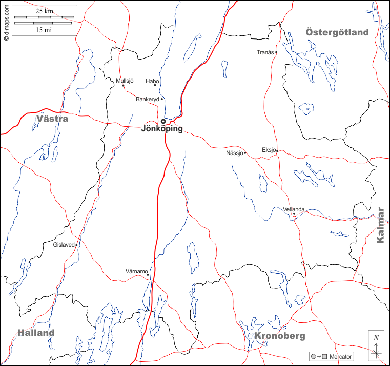 d-maps > Europe > Sweden > Jönköping > boundaries, hydrography, main cities, roads, names, white