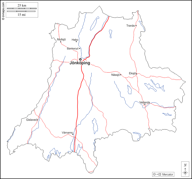 d-maps > Europe > Sweden > Jönköping > outline, hydrography, main cities, roads, names, white