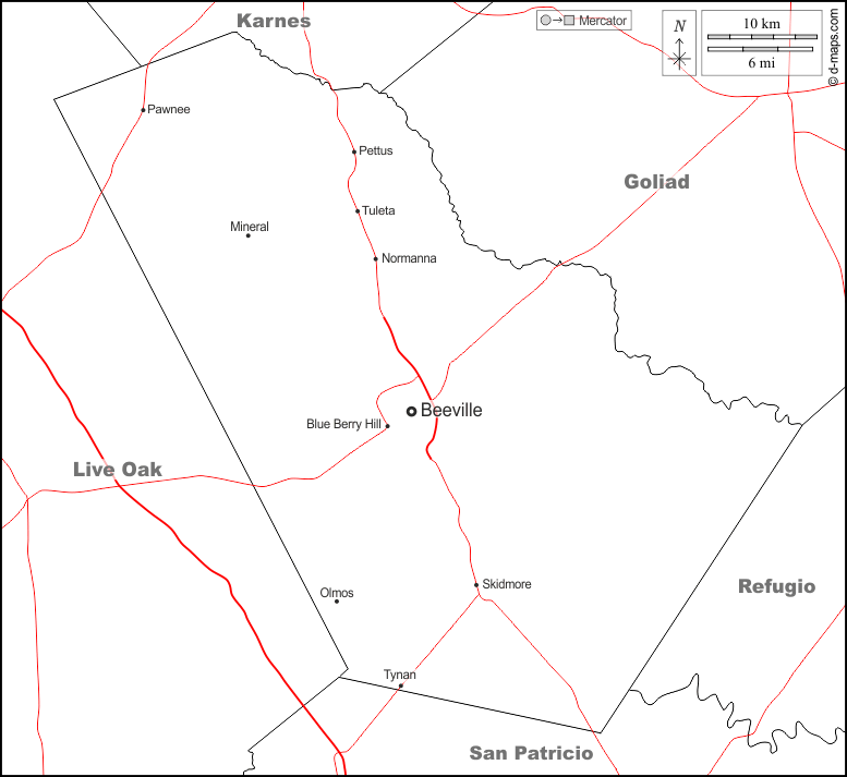 d-maps > United States of America (USA) > Texas > Bee County > boundaries, main cities, roads, names, white