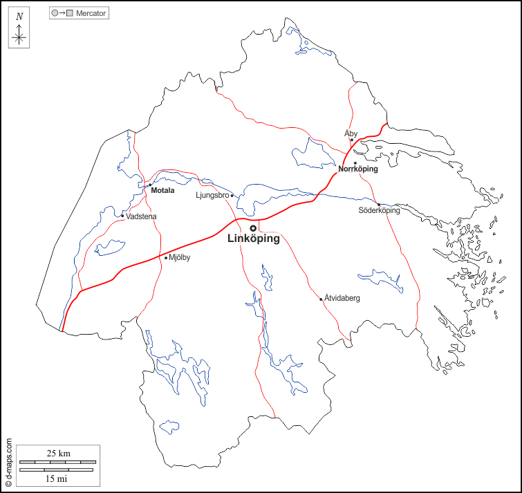 d-maps > Europe > Sweden > Östergötland > outline, hydrography, main cities, roads, names, white
