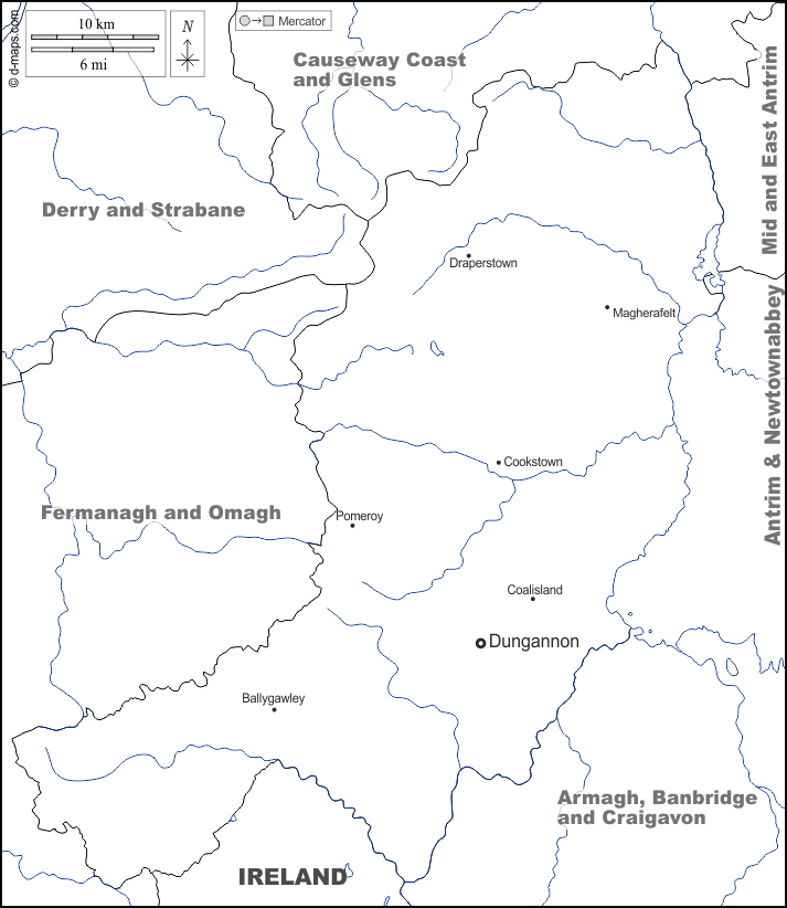 d-maps > Europe > United Kingdom > Mid-Ulster > boundaries, hydrography, main cities, names, white