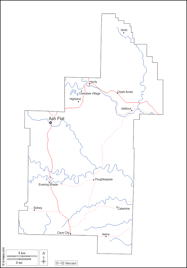 d-maps > United States of America (USA) > Arkansas > Sharp County > outline, hydrography, main cities, roads, names, white