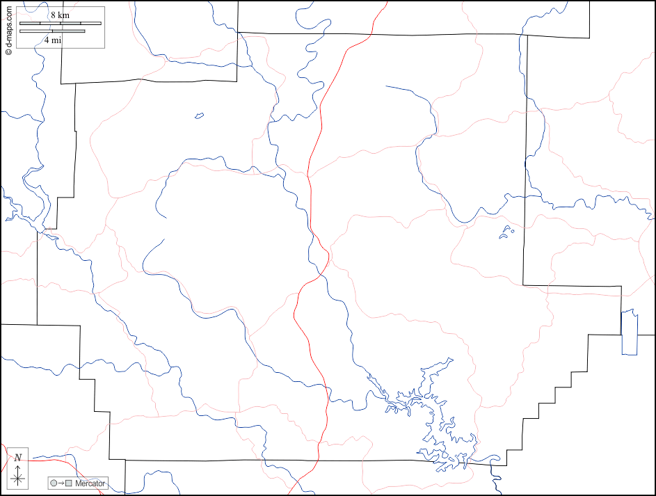 d-maps > United States of America (USA) > Missouri > Wayne County > boundaries, hydrography, roads, white
