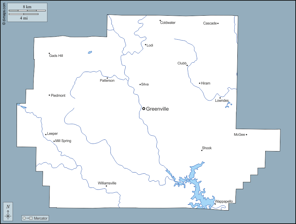 d-maps > United States of America (USA) > Missouri > Wayne County > outline, hydrography, main cities, names