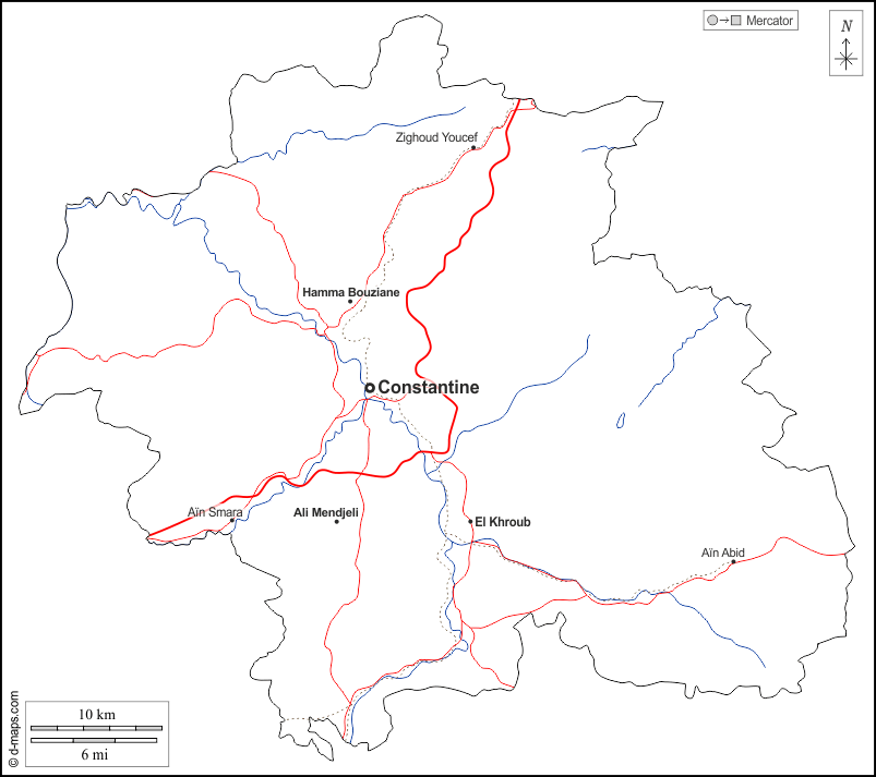 d-maps > Africa > Algeria > Constantine Province > outline, hydrography, main cities, roads, names, white