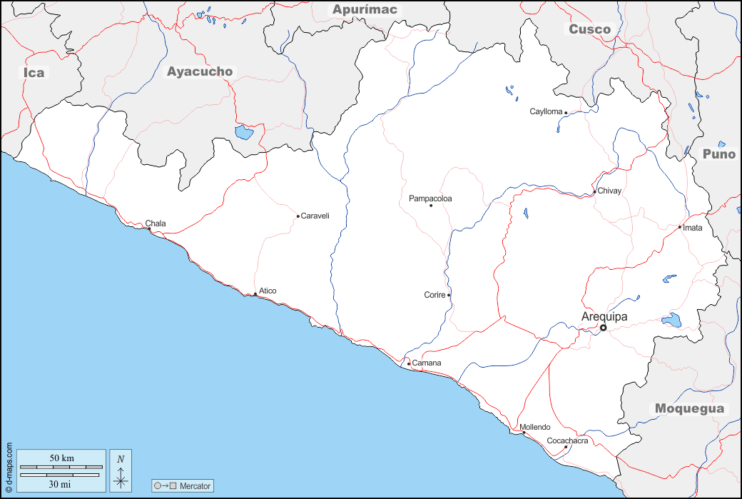 d-maps > Americas > Peru > Arequipa > boundaries, hydrography, main cities, roads, names