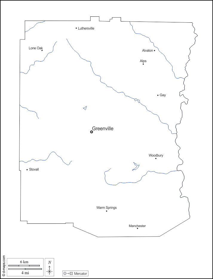 d-maps > United States of America (USA) > Georgia > Meriwether County > outline, hydrography, main cities, names, white