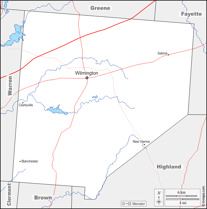 d-maps > United States of America (USA) > Ohio > Clinton County > boundaries, hydrography, main cities, roads, names