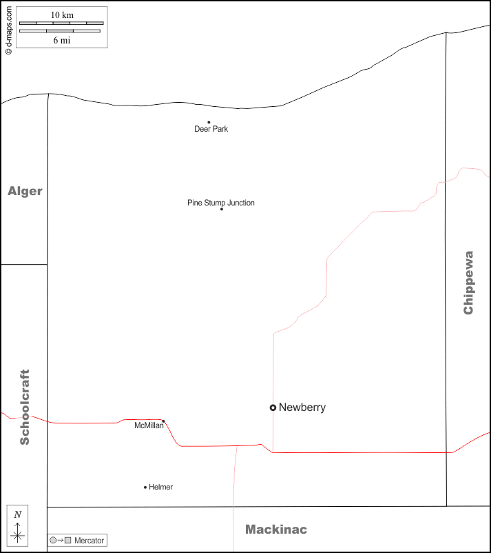 d-maps > United States of America (USA) > Michigan > Luce County > boundaries, main cities, roads, names, white