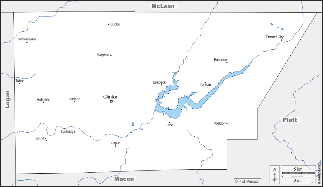 d-maps > United States of America (USA) > Illinois > DeWitt County > boundaries, hydrography, main cities, names