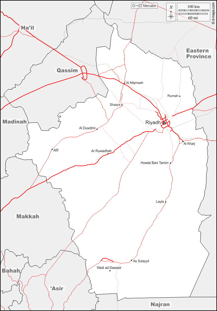 d-maps > Asia > Saudi Arabia > Riyadh Province > boundaries, main cities, roads, names