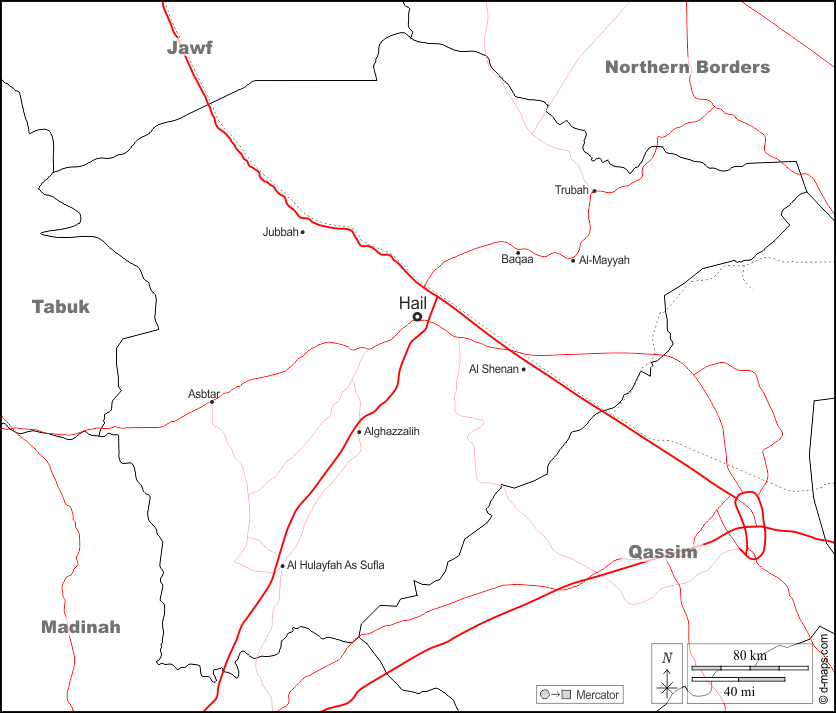 d-maps > Asia > Saudi Arabia > Hail Province > boundaries, main cities, roads, names, white